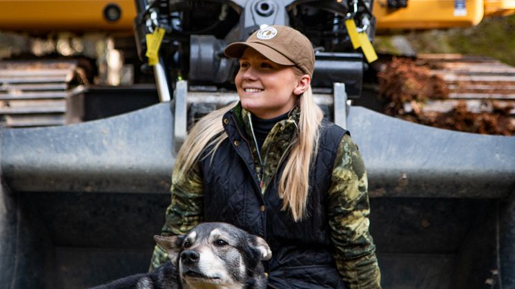 Caroline med hunden Milo och Cat 320 i tätt följe