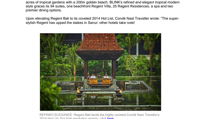 BLINK BASKS IN REFLECTED GLORY AS REGENT BALI LIGHTS UP CONDÉ NAST TRAVELLER'S 2014 'HOT LIST'
