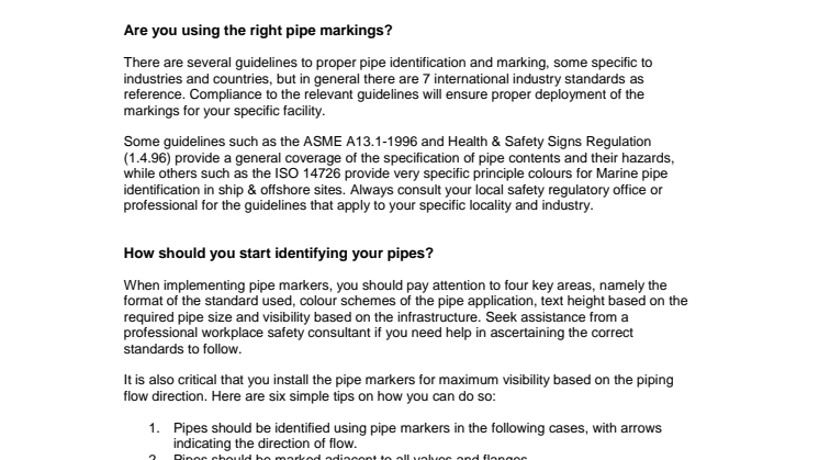 Having a successful pipe identification program helps both employees and external contractors quickly and effortlessly distinguish between pipes during maintenance. Pipe markers also enhance and facilitate traceability for repairs, saving you time and money. In emergency situations, pipe markers aid emergency responders in the quick identification of pipes’ contents, and can make a difference between life and death.Are you using the right pipe markings?