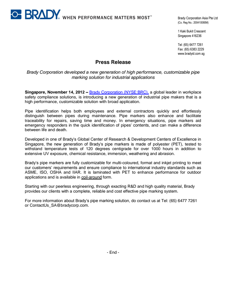 Brady Corporation developed a new generation of high performance, customizable pipe marking solution for industrial applications