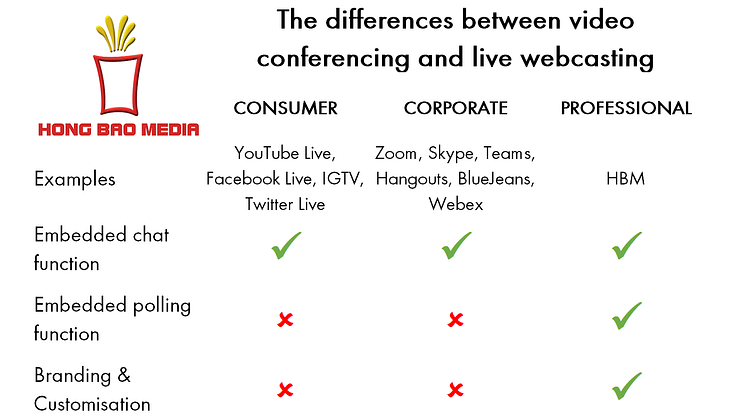 We are finding the difference between video conferences and live webcasting is still poorly understood, so if like so many people you’re new to virtual events, here’s a simple way to look at it:
