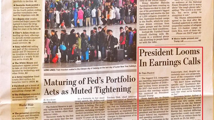 Now the Wall Street Journal has published a front-page article which proves that Asian CEOs must be prepared for these questions. Under the headline "President looms in earnings calls", journalist Theo Francis has analysed the transcripts of earnings calls held by S&P 500 companies and found that President Trump (or the "new administration", as those companies which can't bring themselves to utter his name say) featured in about half of them (!).