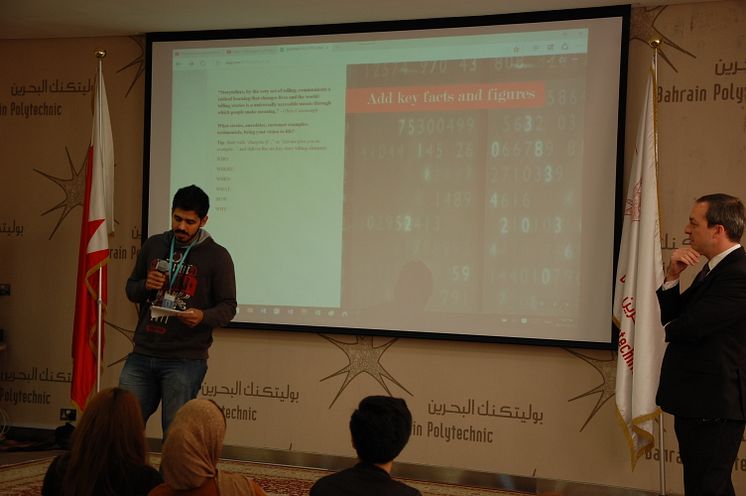 It wasn't all theory at the presentation skills session with Mark Laudi at the Bahrain Polytechnic. Students were given a few minutes to work on presentations in between the sessions, with Mark guiding them on how to make their presentations sharper and more impactful.