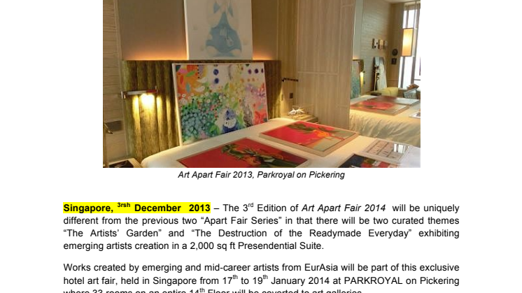 Singapore,December 2013 – The 3rd Edition of Art Apart Fair 2014 will be uniquelydifferent from the previous two “Apart Fair Series” in that there will be two curated themes“The Artists’ Garden” and “The Destruction of the Readymade Everyday” exhibiting emerging artists creation in a 2,000 sq ft Presendential Suite.