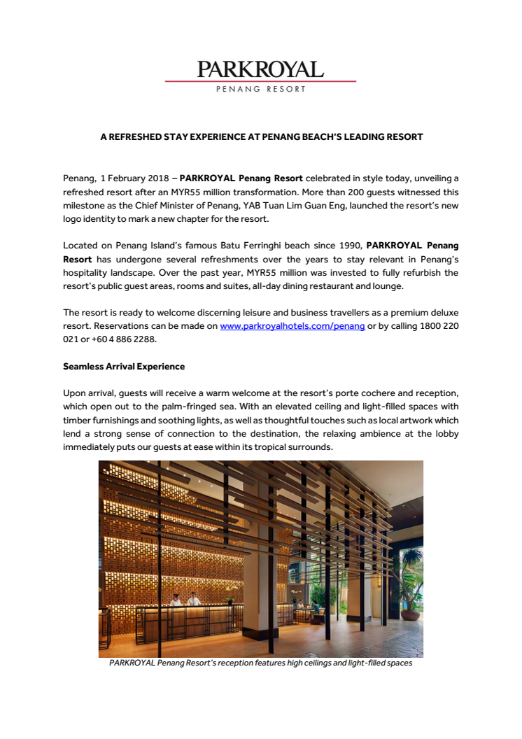 Penang, 1 February 2018 – PARKROYAL Penang Resort celebrated in style today, unveiling a refreshed resort after an MYR55 million transformation. More than 200 guests witnessed this milestone as the Chief Minister of Penang, YAB Tuan Lim Guan Eng, launched the resort’s new logo identity to mark a new chapter for the resort.