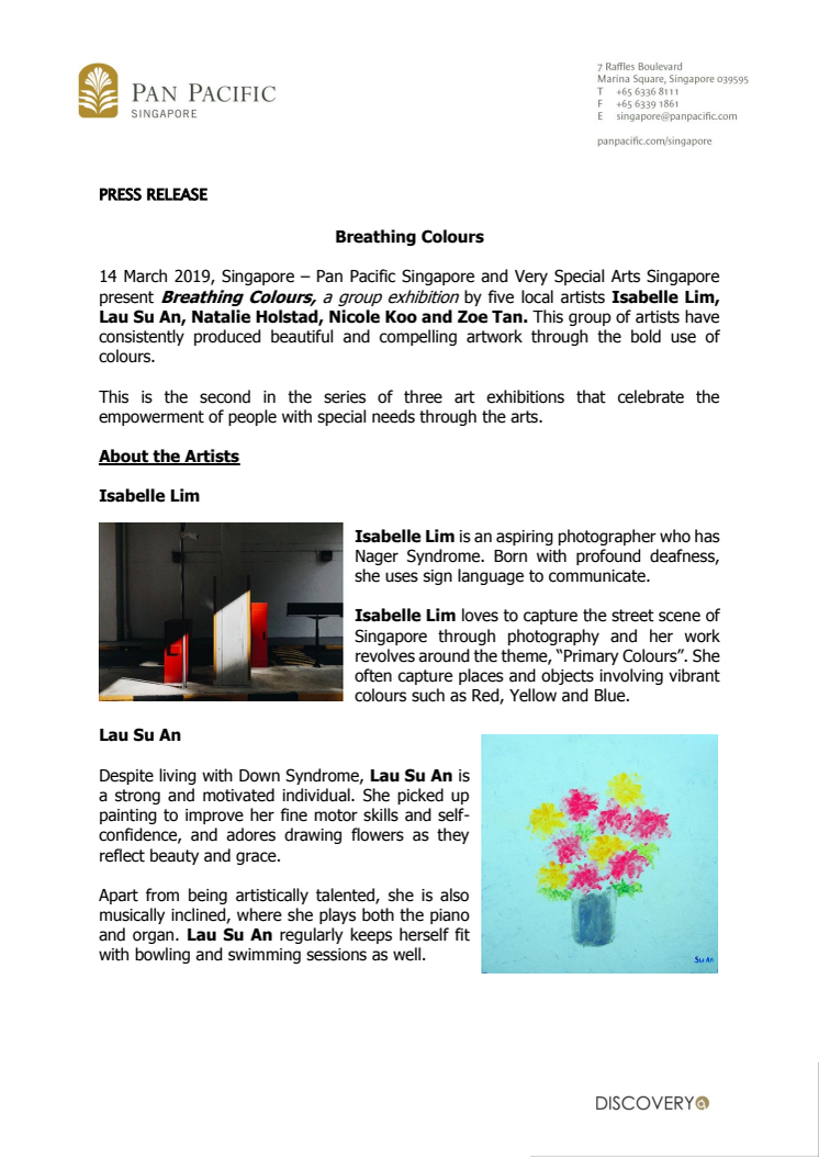 Pan Pacific Singapore and Very Special Arts Singapore present Breathing Colours, a group exhibition by five local artists Isabelle Lim, Lau Su An, Natalie Holstad, Nicole Koo and Zoe Tan. This group of artists have consistently produced beautiful and compelling artwork through the bold use of colours.