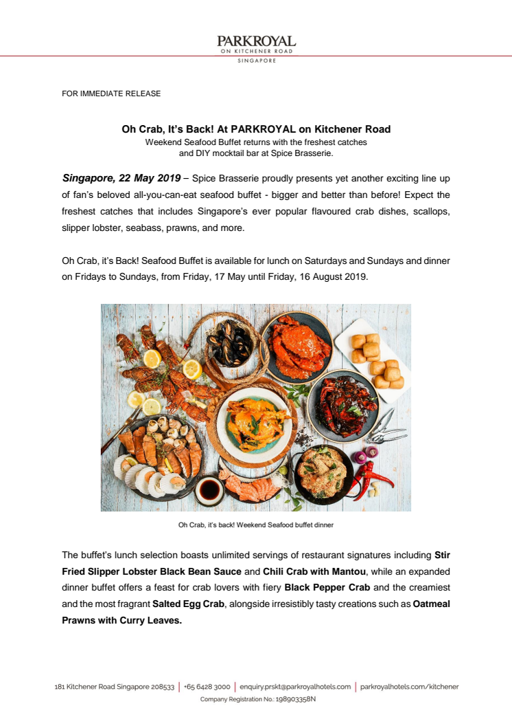 Oh Crab, It's Back! Weekend Seafood Buffet at PARKROYAL on Kitchener Road