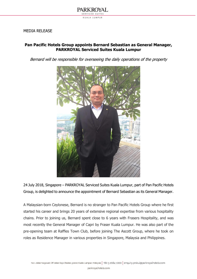 PARKROYAL Serviced Suites Kuala Lumpur, part of Pan Pacific Hotels Group, is delighted to announce the appointment of Bernard Sebastian as its General Manager. Bernard will be responsible for overseeing the daily operations of the property.