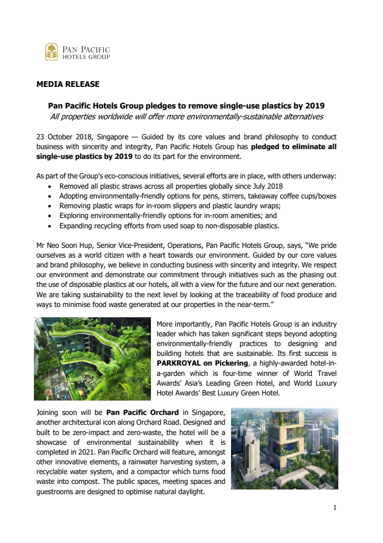 Pan Pacific Hotels Group pledges to remove single-use plastics by 2019