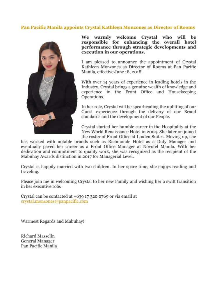 Pan Pacific Manila appoints Crystal Kathleen Monzones as Director of Rooms