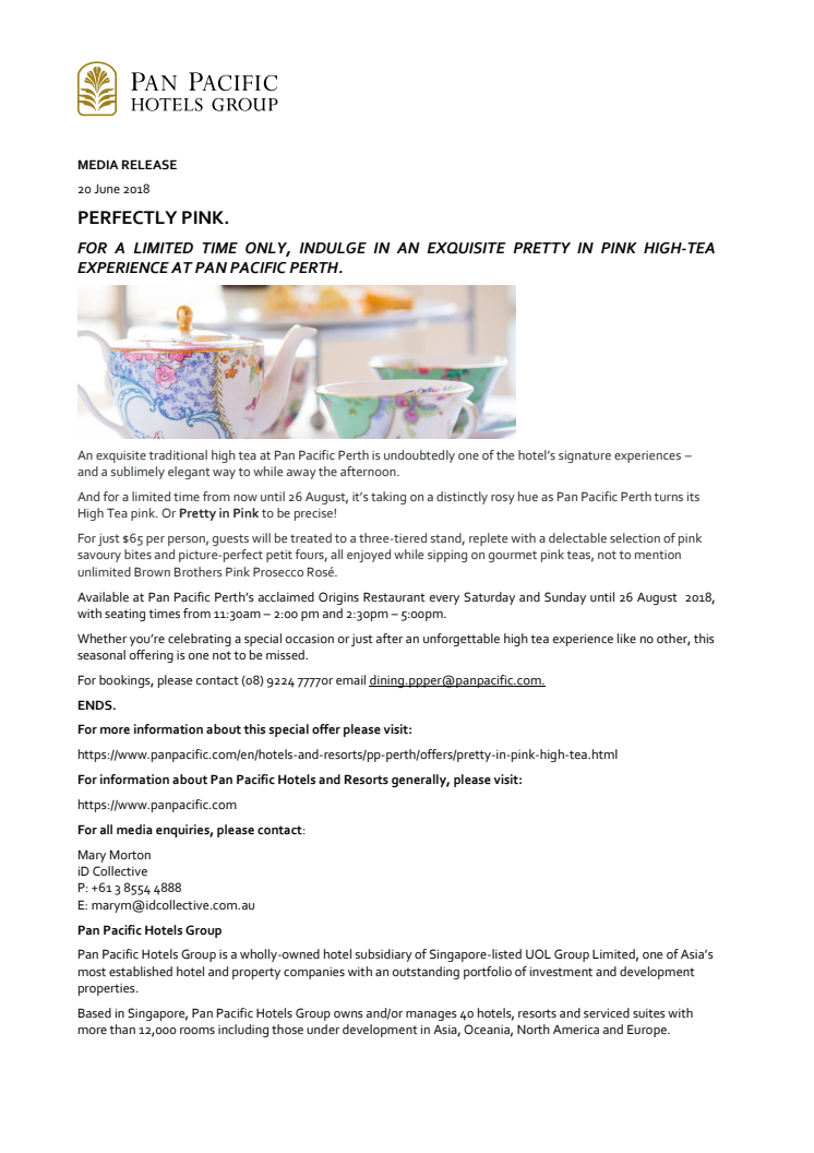 For a limited time only, indulge in an exquisite Pretty in Pink High Tea experience at Pan Pacific Perth.