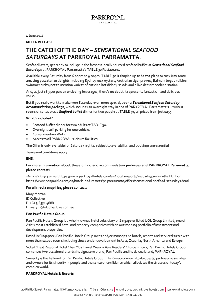 The catch Of The Day – Sensational Seafood Saturday's at PARKROYAL Parramatta