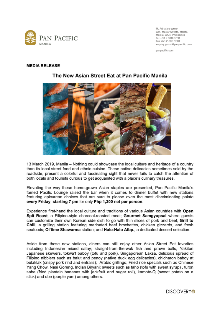 Indulge in a colorful gastronomic journey with local street delicacies and regional Asian favorites presented buffet style at Pacific Lounge every Friday at Php 1,200 net per person.