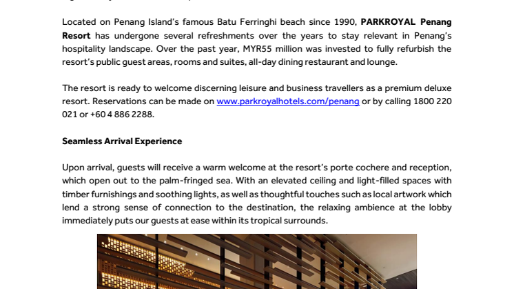 The resort is ready to welcome discerning leisure and business travellers as a premium deluxe resort.Reservations can be made on www.parkroyalhotels.com/penang or by calling 1800 220 021 or +60 4 886 2288.
