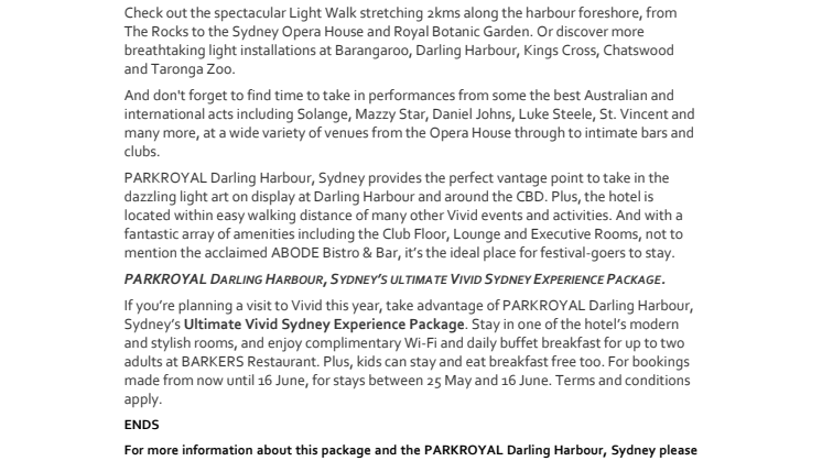If you’re planning a visit to Vivid this year, take advantage of PARKROYAL Darling Harbour, Sydney’s Ultimate Vivid Sydney Experience Package. Stay in one of the hotel’s modern and stylish rooms, and enjoy complimentary Wi-Fi and daily buffet breakfast for up to two adults at BARKERS Restaurant. Plus, kids can stay and eat breakfast free too. For bookings made from now until 16 June, for stays between 25 May and 16 June. Terms and conditions apply.