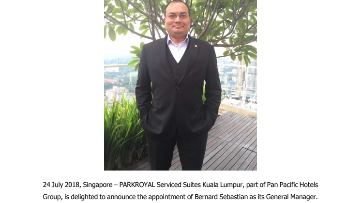 24 July 2018, Singapore – PARKROYAL Serviced Suites Kuala Lumpur, part of Pan Pacific Hotels Group, is delighted to announce the appointment of Bernard Sebastian as its General Manager.