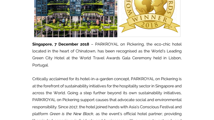 Singapore, 7 December 2018 – PARKROYAL on Pickering, the eco-chic hotel located in the heart of Chinatown, has been recognised as the World’s Leading Green City Hotel at the World Travel Awards Gala Ceremony held in Lisbon, Portugal.
