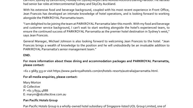 General Manager, Michael Johnson is also looking forward to welcoming Jean Francois to the hotel. “Jean Francois brings a wealth of knowledge to the position and he will undoubtedly be an invaluable addition to PARKROYAL Parramatta’s senior management team.”