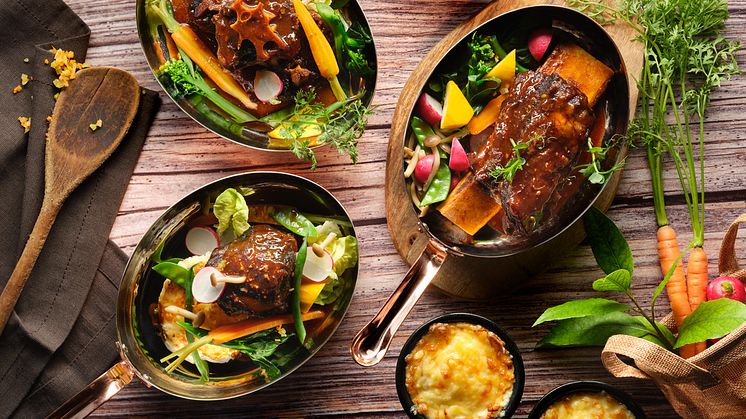 The meat cuts are sous vide for 18 hours in rich Carbernet Sauvignon jus, rosemary, thyme, shallots and garlic, resulting in an irresistible succulence and juicy aromatic meat with a melt-in-your-mouth deliciousness. The hearty delicacies are served with a satisfying Potato Dauphinoise and summer vegetables tossed in Pommery Mustard Vinaigrette.