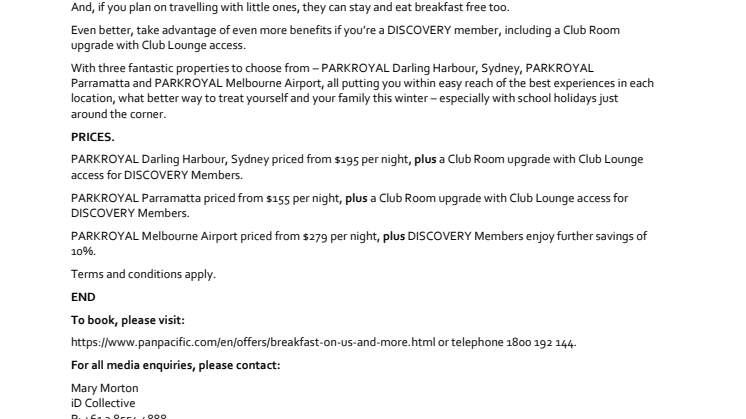 With three fantastic properties to choose from – PARKROYAL Darling Harbour, Sydney, PARKROYAL Parramatta and PARKROYAL Melbourne Airport, all putting you within easy reach of the best experiences in each location, what better way to treat yourself and your family this winter – especially with school holidays just around the corner.