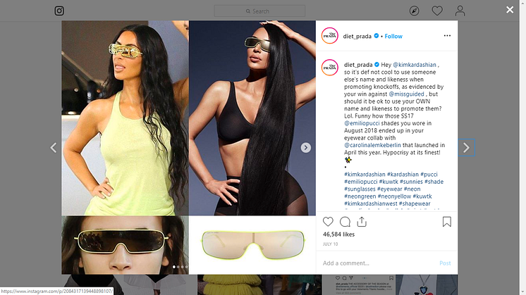 Diet Prada made a mention of Kardashian's recent win in court in its message about the Emilio Pucci sunglasses: "Hey @kimkardashian, so it’s def not cool to use someone else’s name and likeness when promoting knockoffs, as evidenced by your win against @missguided."