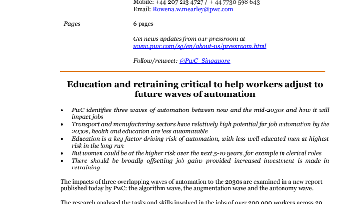Natalie Choo, PwC Singapore, Communications Mobile: +65 8722 7545 E-mail: natalie.yl.choo@sg.pwc.com Rowena Mearley, PwC Global, Communications Mobile: +44 207 213 4727 / + 44 7730 598 643 Email: rowena.w.mearley@pwc.com |