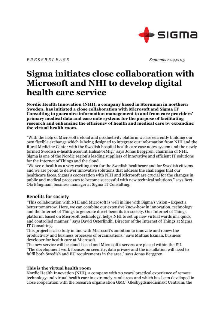 Nordic Health Innovation (NHI), a company based in Storuman in northern Sweden, has initiated a close collaboration with Microsoft and Sigma IT Consulting to guarantee information management to and from care providers’ primary medical data and case note systems for the purpose of facilitating research and enhancing the efficiency of health and medical care by expanding the virtual health room.