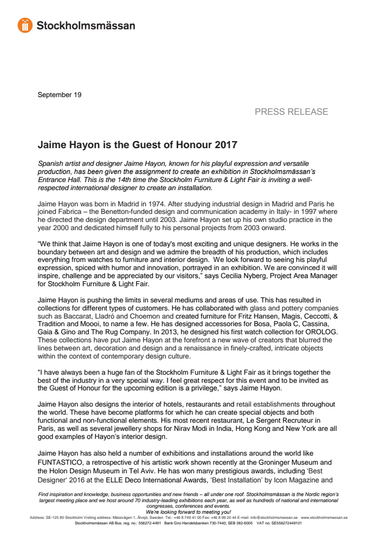 Cecilia Nyberg, Project Area Manager, tel +46 8-749 43 86, cecilia.nyberg@stockholmsmassan.se