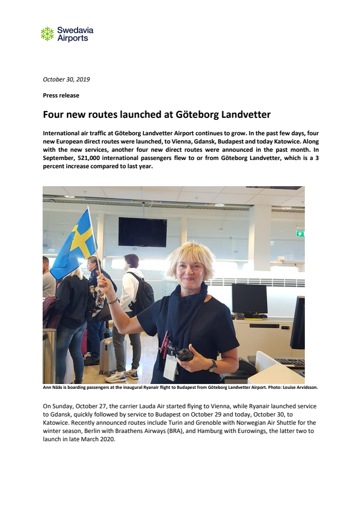 International air traffic at Göteborg Landvetter Airport continues to grow. In the past few days, four new European direct routes were launched. Along with the new services, another four new direct routes were announced in the past month. In September, 521,000 international passengers flew to or from Göteborg Landvetter, which is a 3 per cent increase compared to last year.