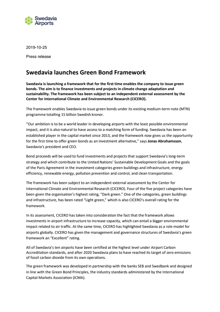 “Our ambition is to be a world leader in developing airports with the least possible environmental impact, and it is also natural to have access to a matching form of funding. Swedavia has been an established player in the capital market since 2013, and the framework now gives us the opportunity for the first time to offer green bonds as an investment alternative,” says Jonas Abrahamsson, Swedavia’s president and CEO.
