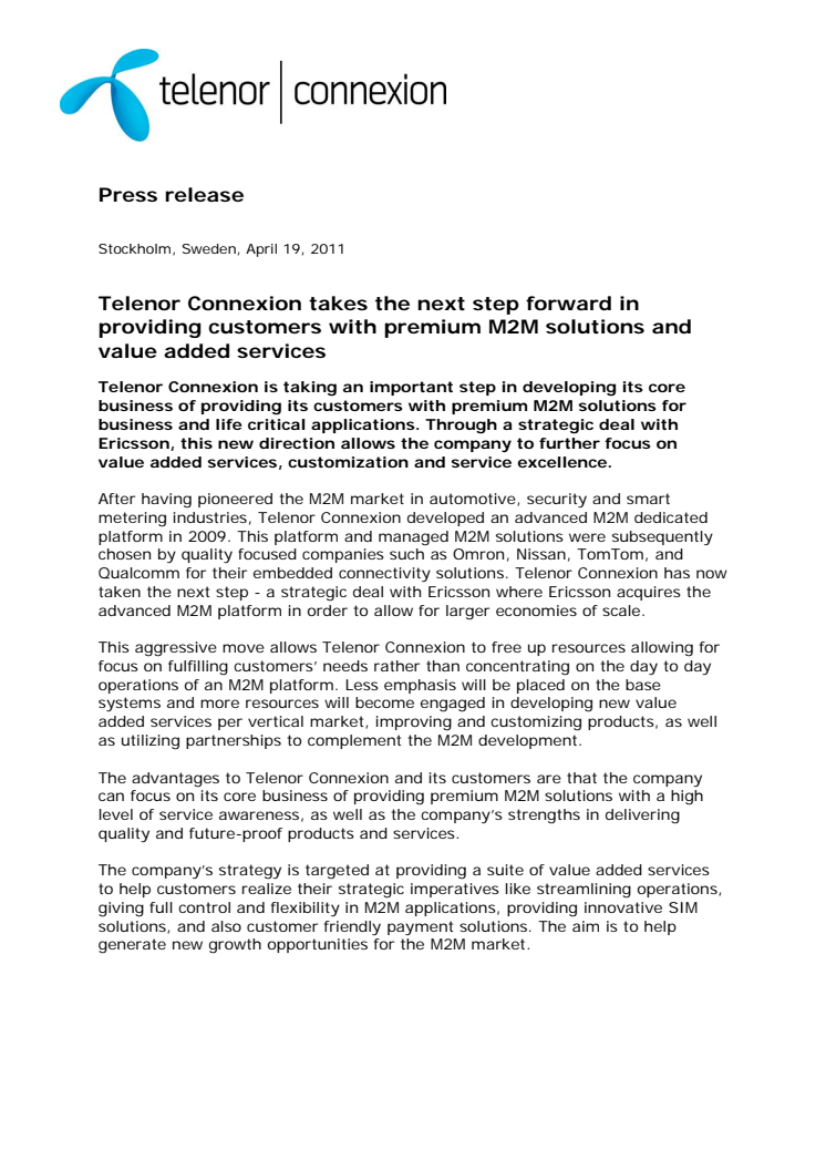 Telenor Connexion is taking an important step in developing its core business of providing its customers with premium M2M solutions for business and life critical applications. Through a strategic deal with Ericsson, this new direction allows the company to further focus on value added services, customization and service excellence.