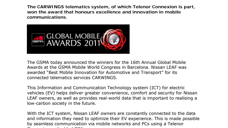 The CARWINGS telematics system, of which Telenor Connexion is part, won the award that honours excellence and innovation in mobile communications.