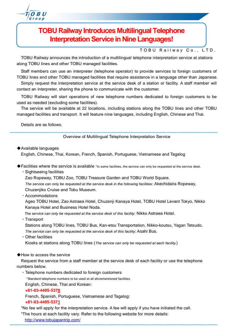 [ENGLISH]TOBU Railway Introduces Multilingual Telephone Interpretation Service in Nine Languages!
