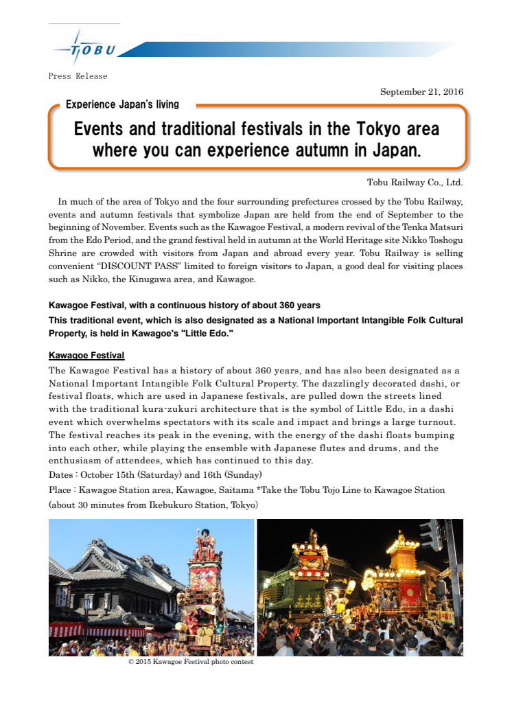 In much of the area of Tokyo and the four surrounding prefectures crossed by the Tobu Railway, events and autumn festivals that symbolize Japan are held from the end of September to the beginning of November. Events such as the Kawagoe Festival, a modern revival of the Tenka Matsuri from the Edo Period, and the grand festival held in autumn at the World Heritage site Nikko Toshogu Shrine are crowd