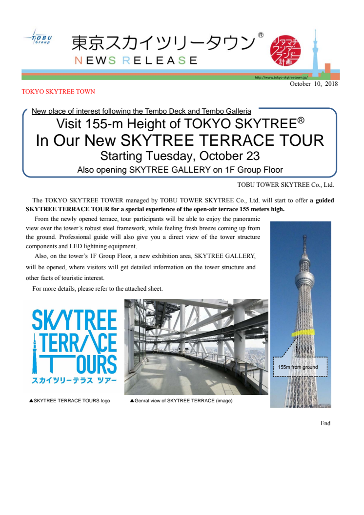 New place of interest following the Tembo Deck and Tembo Galleria. Visit 155-m Height of TOKYO SKYTREE® In Our New SKYTREE TERRACE TOUR Starting Tuesday, October 23 Also opening SKYTREE GALLERY on 1F Group Floor.