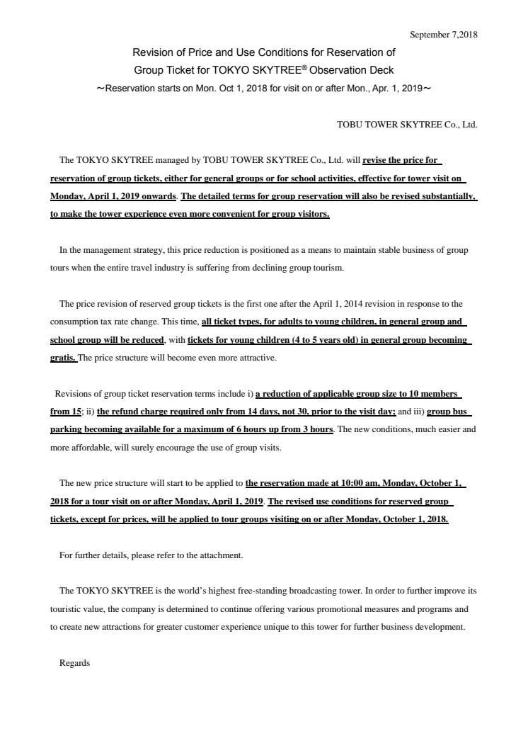 Revision of Price and Use Conditions for Reservation of Group Ticket for TOKYO SKYTREE® Observation Deck ~Reservation starts on Mon. Oct 1, 2018 for visit on or after Mon., Apr. 1, 2019~