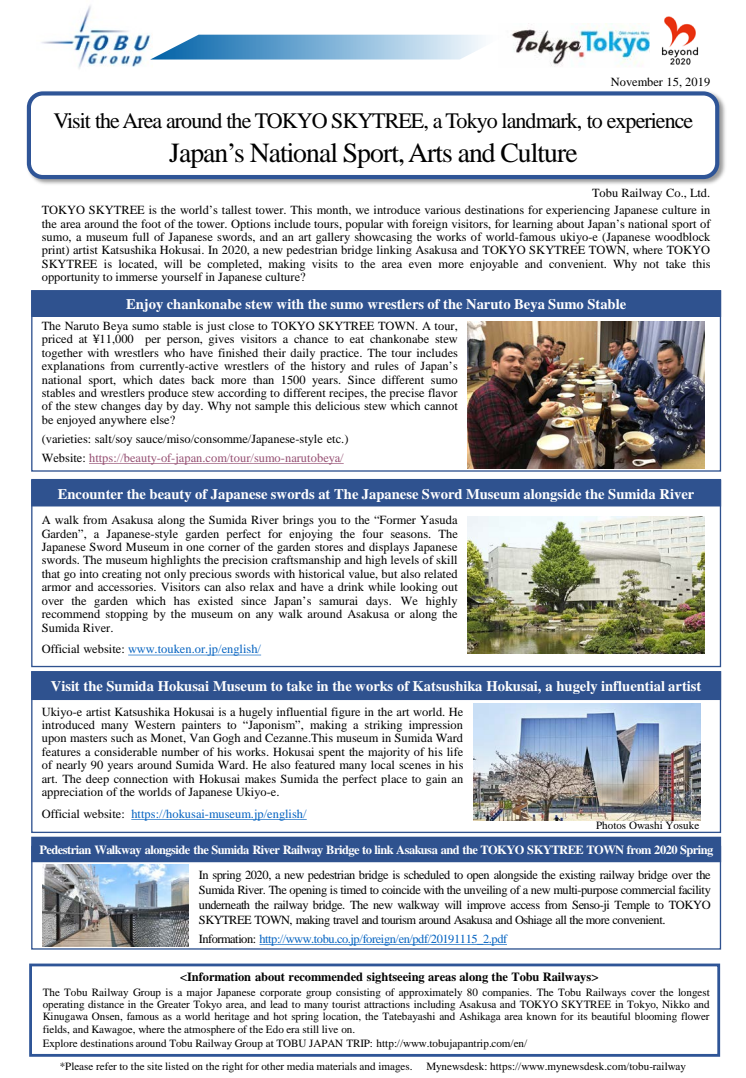 Visit the Area around the TOKYO SKYTREE, a Tokyo landmark, to experience Japan’s National Sport, Arts and Culture