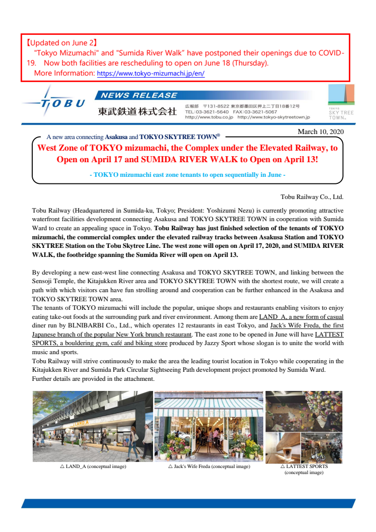 West Zone of TOKYO mizumachi, the Complex under the Elevated Railway, to Open on April 17 and SUMIDA RIVER WALK to Open on April 13!