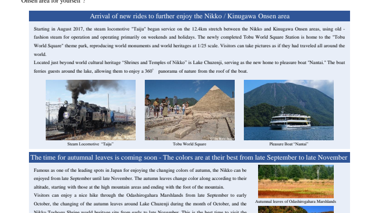 Located about two hours from Tokyo along the TOBU Railway line is the Nikko / Kinugawa Onsen area, home to world cultural heritage “Shrines and Temples of Nikko” and famous as one of Kanto's leading hot spring resorts. This summer has seen the arrival of many attractions one after another, including the steam locomotive "Taiju" and the "Nantai" pleasure boat, taking guests on trips around nature filled Lake Chuzenji. The area will also see the arrival of the autumn season from late September to late November, painting the area with vivid orange, red, and yellow leaves. Why not take this occasion to enjoy the beautiful Nikko / Kinugawa Onsen area for yourself ?