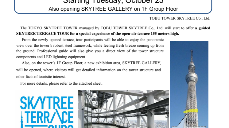 • New place of interest following the Tembo Deck and Tembo Galleria. Visit 155-m Height of TOKYO SKYTREE® In Our New SKYTREE TERRACE TOUR Starting Tuesday, October 23 Also opening SKYTREE GALLERY on 1F Group Floor.