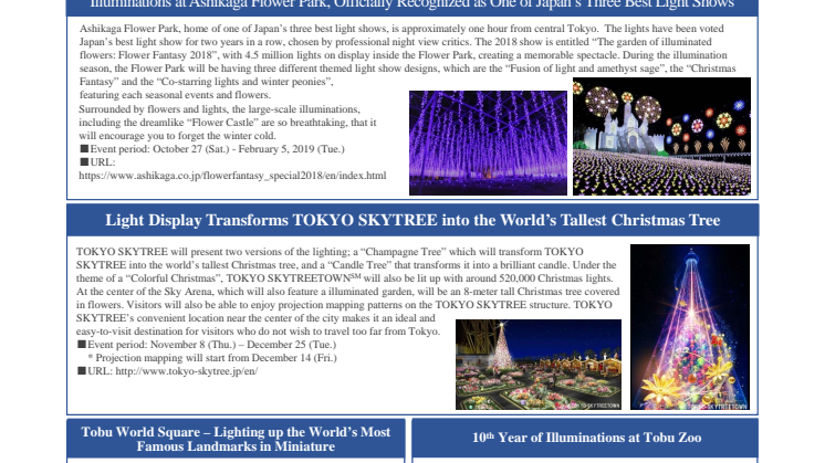 • Beautiful Illuminations Light up the Winter Sky in Japan. Enrich Your Nightlife with Seasonal Illuminations on View for a Limited Time Only.