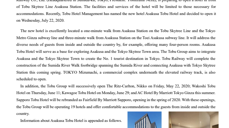 • Tobu to Open Asakusa Tobu Hotel on Wednesday, July 22, 2020 Bookings will begin on the Tobu Hotel Management’s website from Monday, February 10