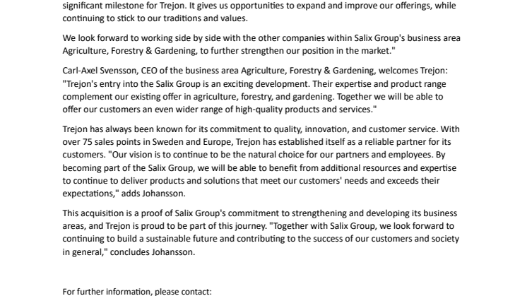 "- Joining the Salix Group is a significant milestone for Trejon. It gives us opportunities to expand and improve our offerings, while continuing to stick to our traditions and values. We look forward to working side by side with the other companies within Salix Group's business area Agriculture, Forestry & Gardening, to further strengthen our position in the market."