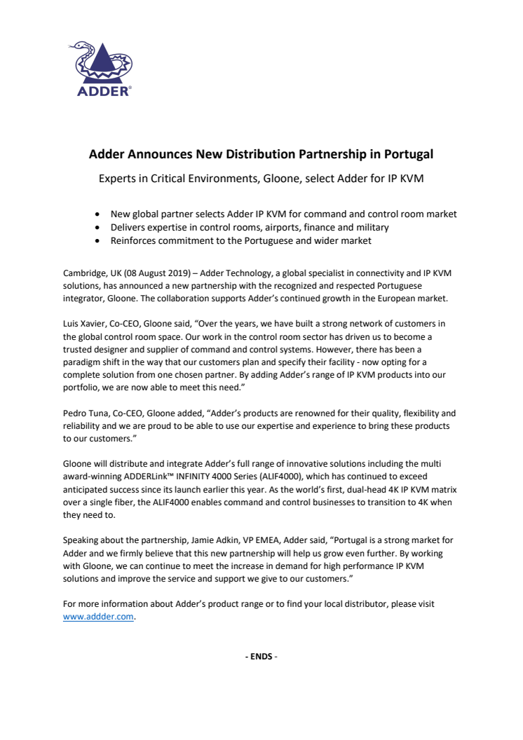 Adder Announces New Distribution Partnership in Portugal