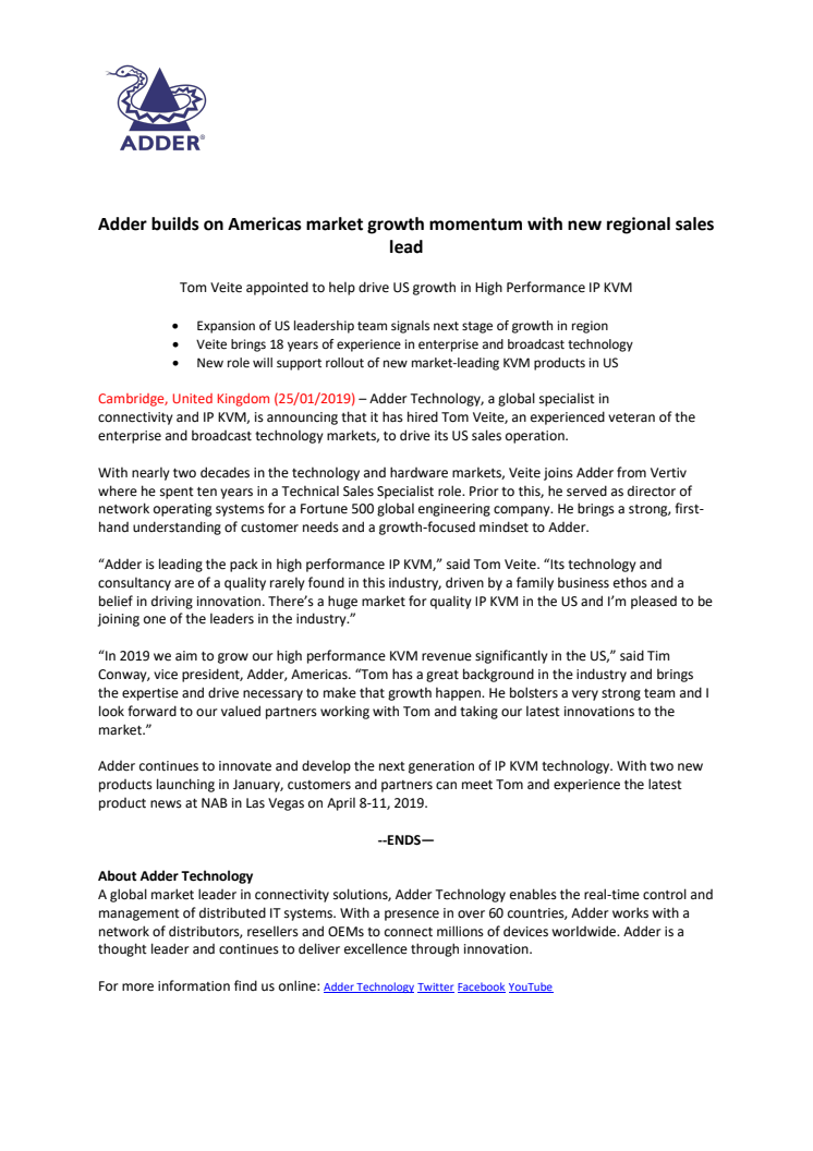 Tom Veite appointed to help drive US growth in High Performance IP KVM