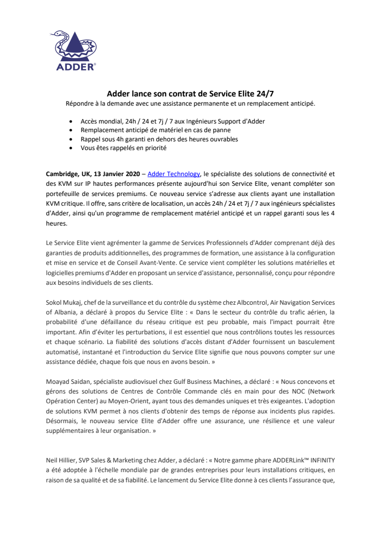 Adder lance son contrat de Service Elite 24/7