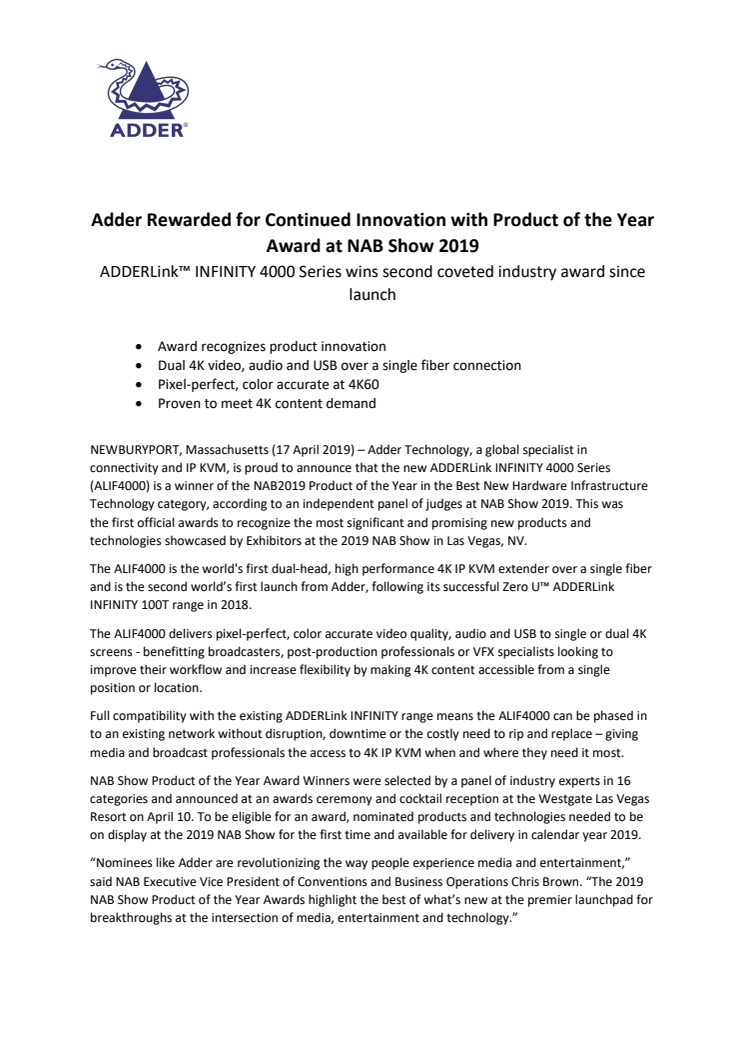 Adder Rewarded for Continued Innovation with Product of the Year Award at NAB Show 2019