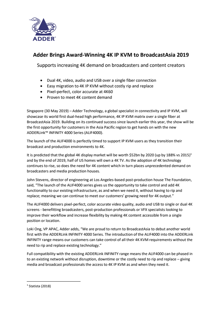 Singapore (30 May 2019) – Adder Technology, a global specialist in connectivity and IP KVM, will showcase its world first dual-head high performance, 4K IP KVM matrix over a single fiber at BroadcastAsia 2019. Building on its continued success since launch earlier this year, the show will be the first opportunity for customers in the Asia Pacific region to get hands-on with the new ADDERLink™ INFINITY 4000 Series (ALIF4000).
