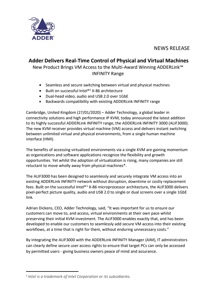 Cambridge, United Kingdom (27/01/2020) – Adder Technology, a global leader in connectivity solutions and high performance IP KVM, today announced the latest addition to its highly successful ADDERLink™ INFINITY range, the ADDERLink INFINITY 3000 (ALIF3000). The new KVM receiver provides virtual machine (VM) access and delivers instant switching between unlimited virtual and physical environments, from a single human-machine interface (HMI).