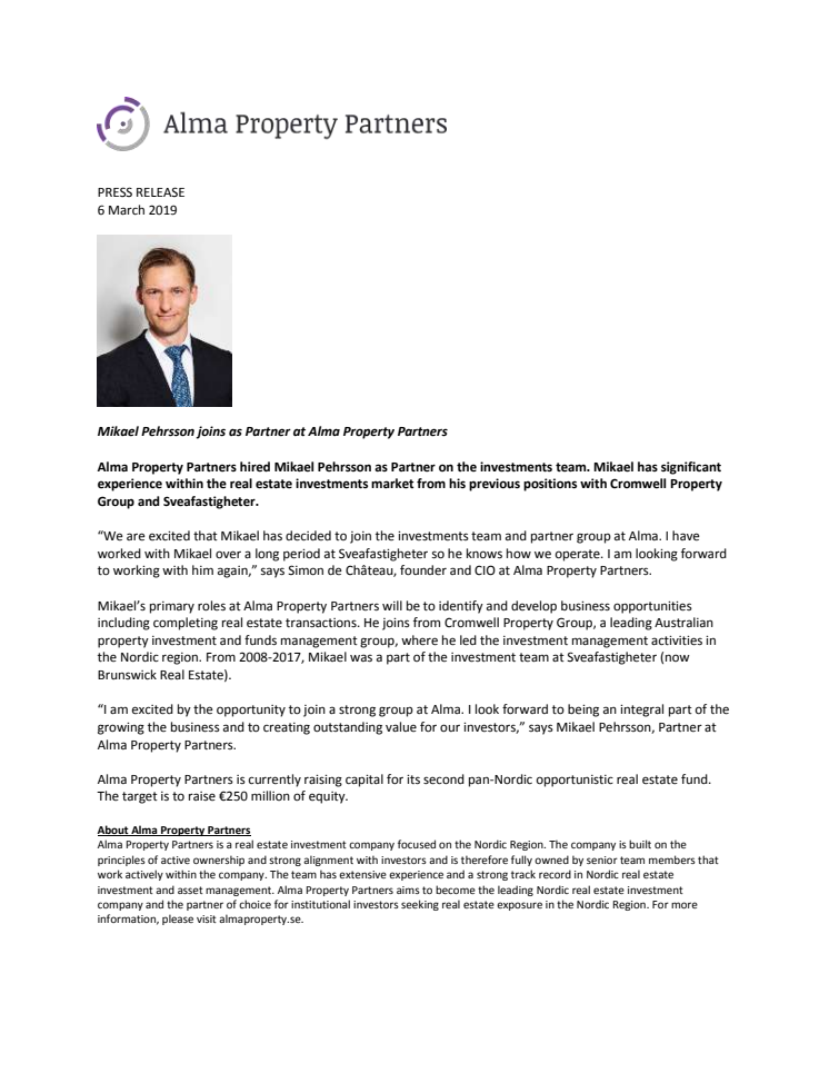 “I am excited by the opportunity to join a strong group at Alma. I look forward to being an integral part of the growing the business and to creating outstanding value for our investors,” says Mikael Pehrsson, Partner at Alma Property Partners.